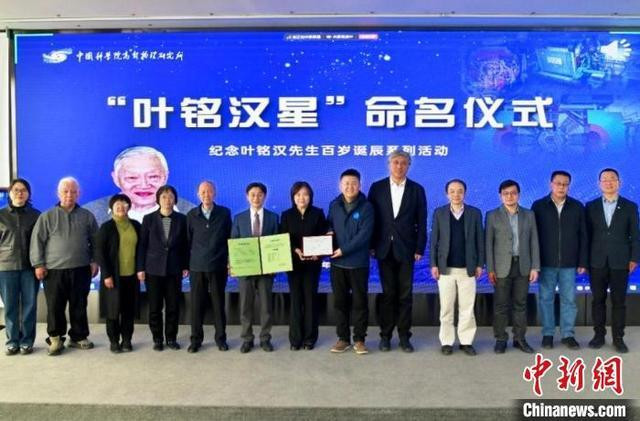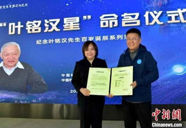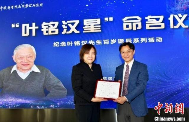 “叶铭汉星”命名仪式近日在北京中国科学院高能所举行。中国科学院国家天文台台长刘继峰宣读“叶铭汉星”命名公报和命名证书,并向叶铭汉女儿叶如茵颁授命名公报和证书。中国科学院高能所所长曹俊向叶如茵颁授“叶铭汉星”运行轨道图。中国科学院国家天文台邹虎研究员介绍“叶铭汉星”发现过程和运行轨道。